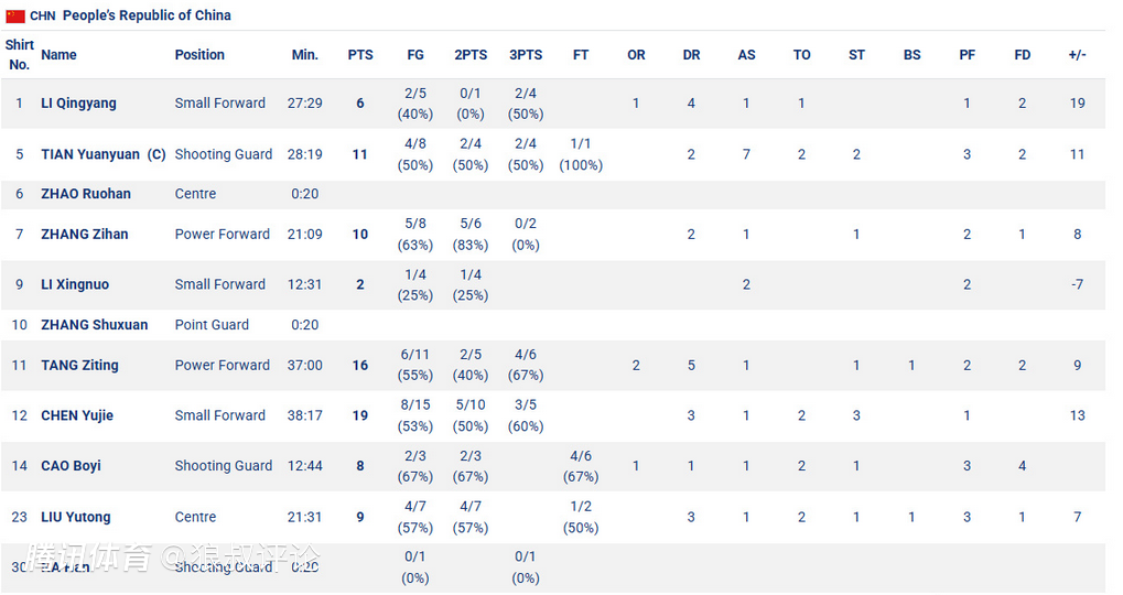 李青阳6分4篮板、田媛媛11分7助攻、张梓涵10分、李星诺2分、唐子婷16分5篮板、陈玉捷19分、曹博怡8分、刘禹彤9分3篮板。