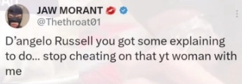 2025-07-26 12:40北京时间7月26日,独行侠新援拉塞尔疑似在女友怀孕期间出轨色情女星Jaw Morant,还被对方泄露了私信。