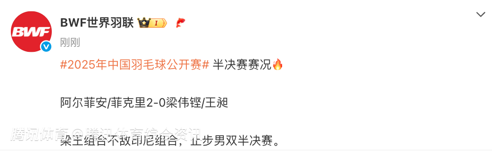 2025-07-26 19:50北京时间7月26日,中国羽毛球公开赛继续进行,男双半决赛,梁伟铿/王昶0-2不敌费克里/阿尔菲安,无缘决赛。
