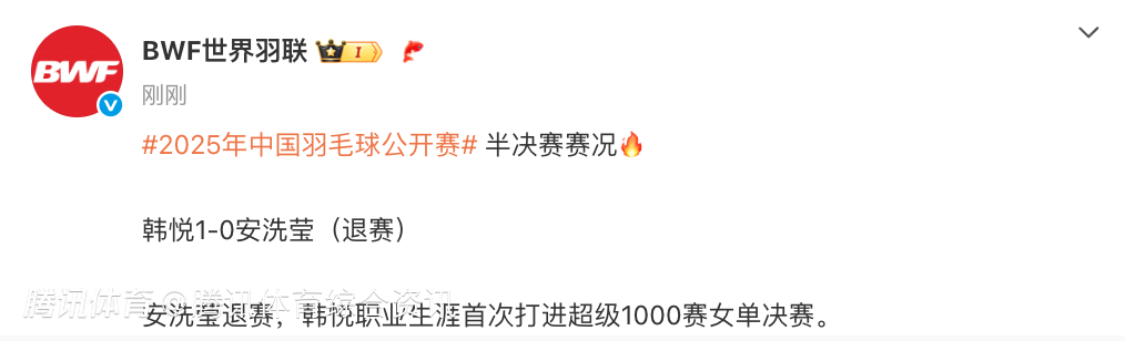 2025-07-26 20:40北京时间7月26日,中国羽毛球公开赛继续进行,女单半决赛,安洗莹在第二局退赛,韩悦1-0击败对手,生涯首次晋级1000赛女单决赛。