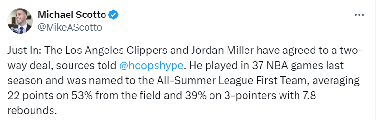 乔丹-米勒是2023年次轮总第48顺位秀,已经为快船效力两个赛季。上赛季,他出战了37场NBA比赛,场均4.1分1.6篮板。今年夏季联赛,米勒发挥出色,入选夏季联赛最佳阵容一阵,在夏季联赛中场均得到22分,投篮命中率53%,三分球命中率为39%,同时还能贡献7.8个篮板。