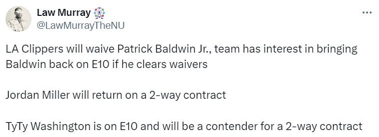 快船双向合同一签一裁!迎回米勒放弃鲍德温 当前阵容仍为14+3