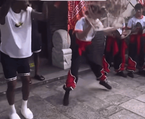 从视频中可以看到,莫兰特在“舞狮师傅”的教导下,努力学习着舞狮技巧,一招一式确实学得像模像样。