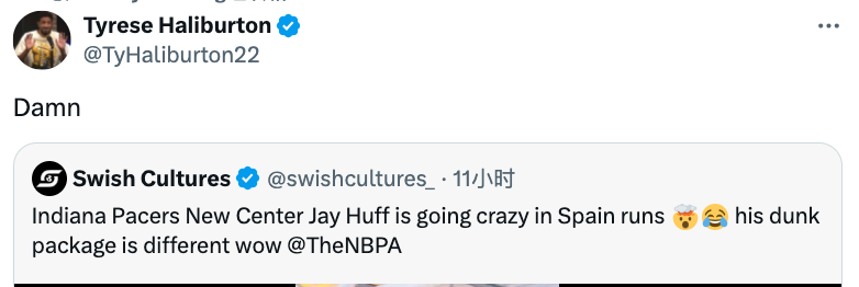 稍早前,哈利伯顿转发了一段赫夫在野球场上的高光集锦,并且配文写道:“Damn”,视频中,赫夫多次上演暴扣,并且施展了自己的外线投射能力,表现非常出色。