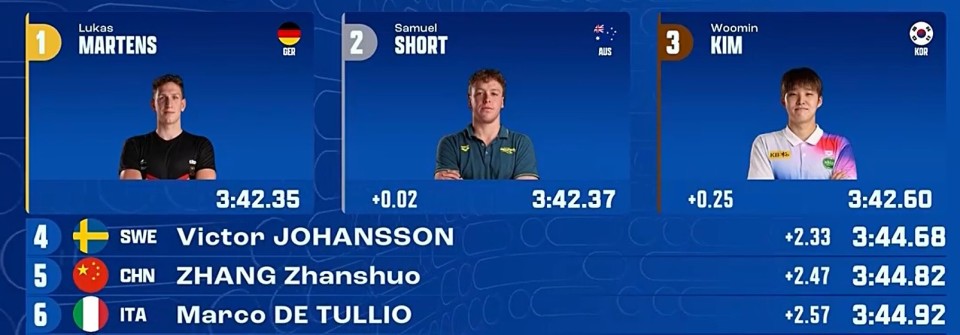 马尔滕斯以3分42秒35获得了冠军,肖特3分42秒37的成绩获得亚军,获得季军的是游出3分42秒60的韩国选手金禹旻。