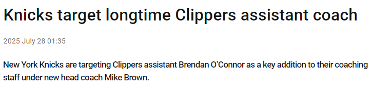 2025-07-28 06:50北京时间7月28日,据尼克斯队记Ian Begley报道,尼克斯队正将目标锁定在快船队助理教练布兰登-奥康纳身上,他们正围绕新任主教练迈克-布朗重组教练组。