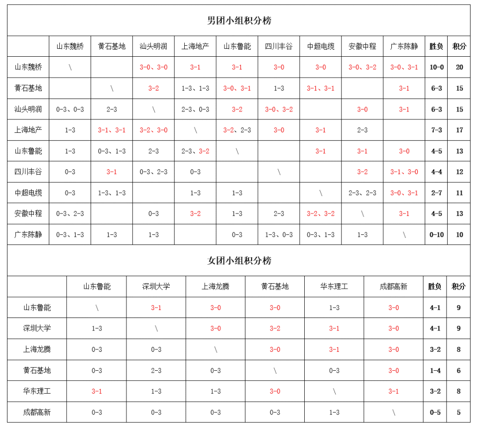 18:30,山东魏桥·向尚运动男团VS黄石基地·华新男团、汕头明润男团VS中超电缆·福建安井男团、山东鲁能男团VS四川丰谷男团,山东鲁能女团VS成都高新若水居女团、上海龙腾女团VS黄石基地·华新女团。
