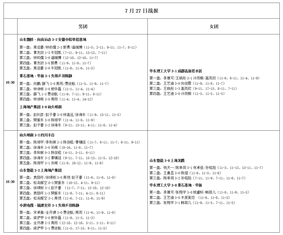 其余世界冠军在27日的表现各有不同,其中林诗栋(黄石基地·华新)3-0胜敖华磊、3-0胜周雨,王艺迪(华东理工大学)3-0胜向俊霖、3-0胜冷雨桐、3-0胜木原美悠,王曼昱(山东鲁能)3-0胜陈熠,陈幸同(山东鲁能)3-2胜孙铭阳,林高远(汕头明润)搭档徐海东0-3不敌赵钊彦/赵子豪,各球队的详细战况如下: