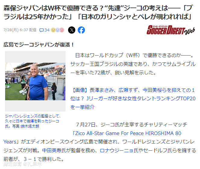 2025-07-28 10:30北京时间7月28日,72 岁的巴西足球传奇人物济科,就日本队能否夺得世界杯冠军发表了看法,济科认为日本队终有一天能登上世界之巅。