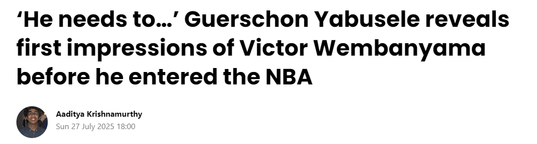 2025-07-28 12:00北京时间7月28日,尼克斯新援亚布塞莱在近日做客新队友布伦森和哈特的播客节目时,谈及了自己初见文班亚马时的感受。尽管天赋和特质令人惊叹,这位法国国家队队友曾对文班亚马在NBA的成功存有一些疑虑。