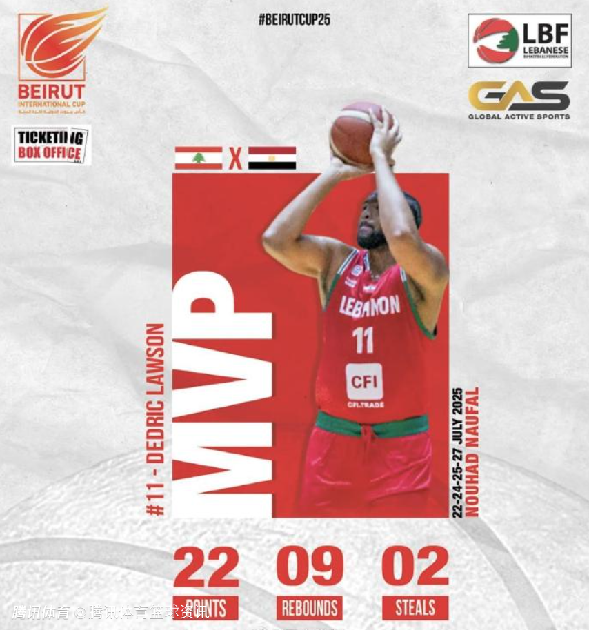 本次贝鲁特杯,共有黎巴嫩、约旦、伊朗、埃及、叙利亚五队参赛。在黎巴嫩首战以89-79击败约旦的比赛中,劳森首秀表现抢眼,拿到12分6篮板9助攻的全面数据。