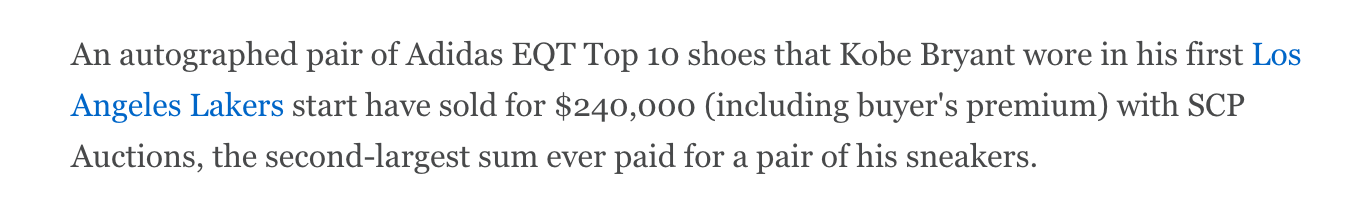 2025-07-28 18:00北京时间7月28日,据ESPN报道,科比首次代表洛杉矶湖人首发出战时所穿的一双带有其签名的阿迪达斯EQT Top 10球鞋,在SCP拍卖行以24万美元(含买家佣金)的价格成交,这是其球鞋拍卖价格第二高的纪录。今年2月,科比在2013年跟腱断裂时所穿的Nike Kobe 8 Elite “湖人主场”球鞋,在苏富比拍卖行以66万美元的价格成交。