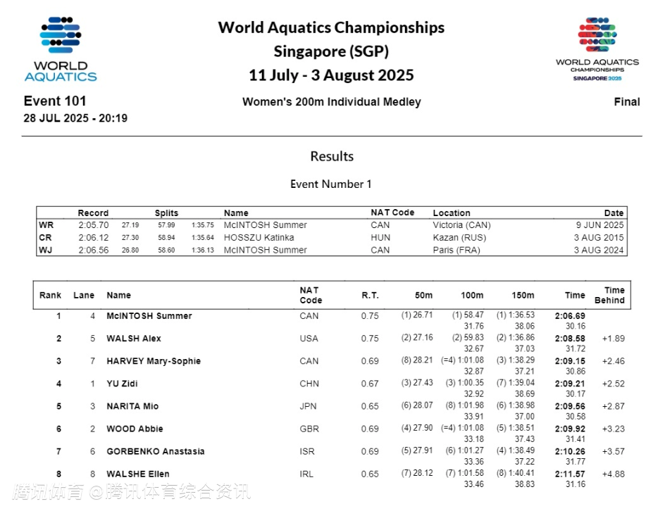 未来可期!12岁“小孩姐”于子迪获200米混合泳第四名 加拿大名将麦金托什夺金
