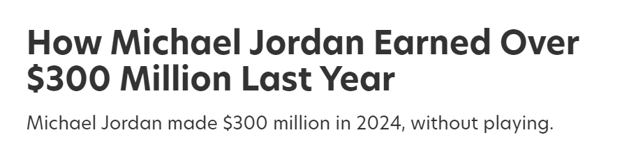 这一令人瞠目的数字,是他整个NBA职业生涯收入(9370万美元)的三倍多,足以凸显出乔丹在退役数十年后,仍处于独一档的地位。
