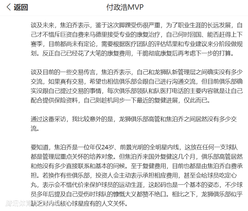 “谈及未来,焦泊乔表示,鉴于这次脚踝受伤很严重,为了职业生涯的长远发展,自己才不惜斥巨资自费来马德里接受专业的康复治疗,”该媒体人在社媒上写道。
