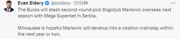 2025-07-29 08:20北京时间7月29日,根据NBA记者Evan Sidery报道,雄鹿队将在新赛季让今年的47号秀马尔科维奇继续留在欧洲。
