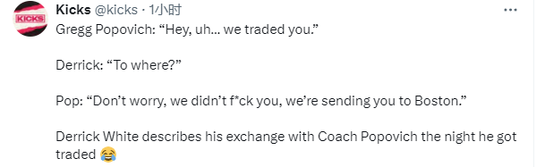 怀特表示,交易当晚波波维奇通知了自己,当时波波维奇对他说道;“嘿,呃……我们把你交易了。”怀特反问道:“去哪?”波波维奇则安抚怀特:“别担心,我们没坑你,把你送到波士顿了。”