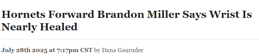 2025-07-29 09:10北京时间7月29日,黄蜂球员布兰登-米勒接受媒体采访,表示他接受过手术的右手腕“目前恢复程度大概在90%到95%左右”,并宣称下赛季开始时自己已准备好上场打球。