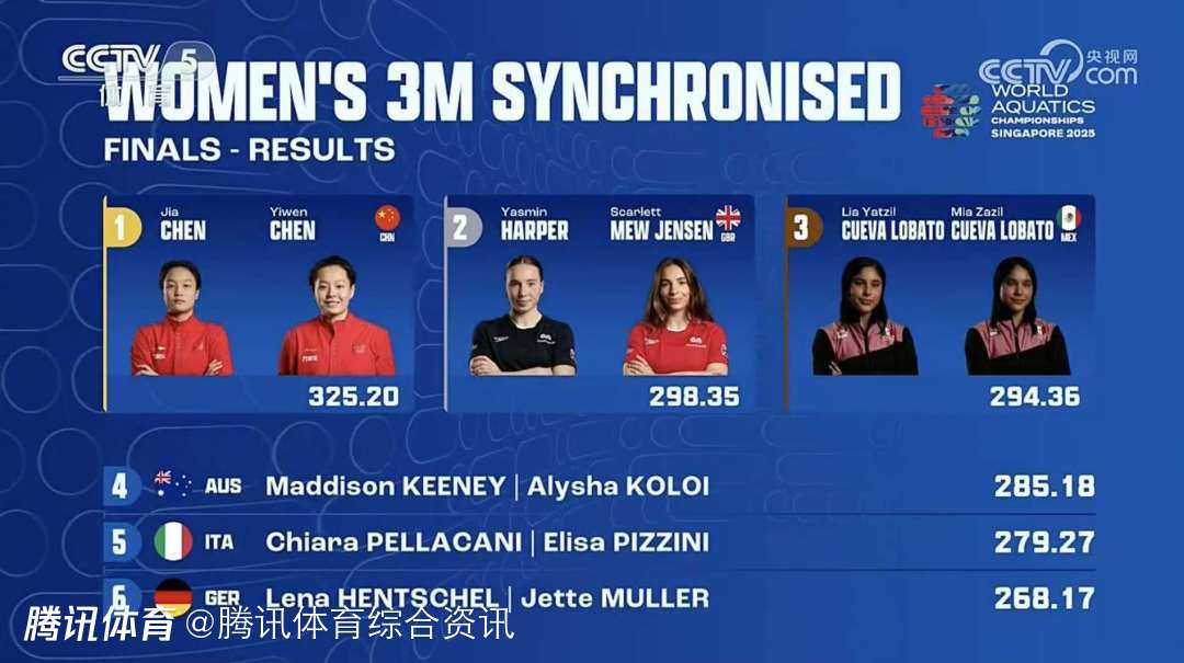 2025-07-29 16:40北京时间7月29日,在2025年新加坡世界泳联世锦赛女子双人3米板决赛中,中国组合陈艺文/陈佳以绝对优势夺冠,为中国跳水队赢得本届赛事第6枚金牌,同时延续了中国队在该项目上世锦赛14连冠的传奇纪录。