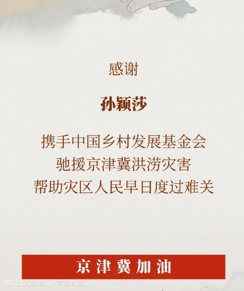 近日,华东、华北等地持续遭遇强降雨,引发洪涝和地质灾害,造成北京、天津、河北等地部分乡村严重汛情灾情。感谢孙颖莎对灾情的持续关注,通过中国乡村发展基金会捐赠应急箱、女性关爱应急箱、面油包、夏凉被等物资,驰援京津冀洪涝灾害。场内为国争光,场外温暖传递。