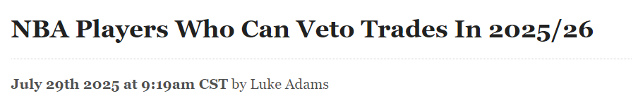 2025-07-30 06:10北京时间7月30日,2025-26赛季,联盟中拥有明确交易否决权的球员只有詹姆斯和利拉德,但在这个赛季有权利否决交易的可不止是他们俩。