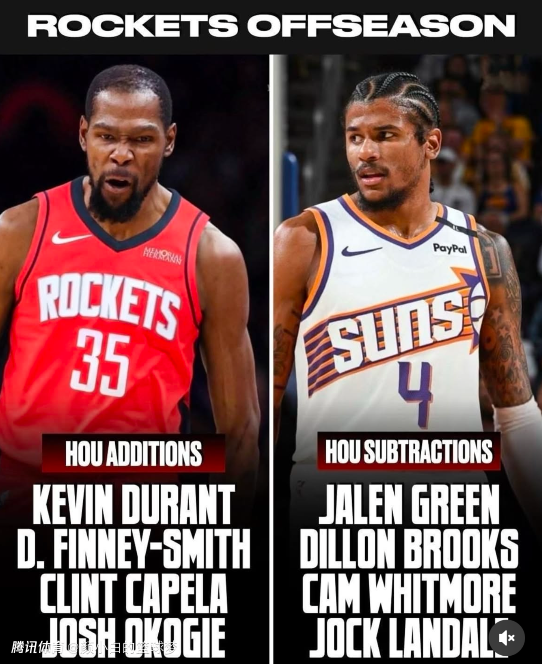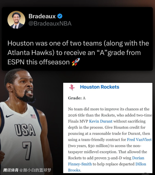 火箭“4换4”运作评级A!休媒预计至少55胜 美记称KD最适配休斯顿