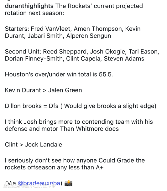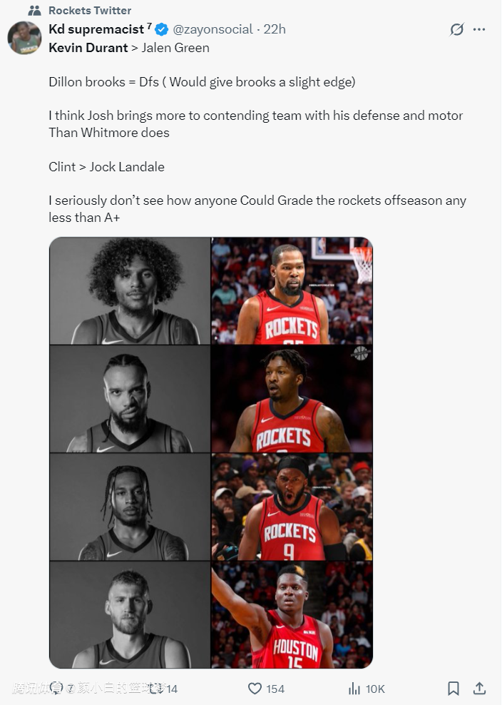 休媒写道:杜兰特>格林、芬尼-史密斯=格林、卡佩拉>兰代尔,奥科吉在防守/积极性等方面也远超过惠特莫尔的贡献,我甚至觉得火箭今夏的运作评级应该是A+。