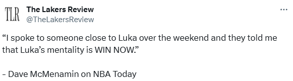 谈到了即将与湖人续约的东契奇,Dave McMenamin在节目中透露:上周末我和卢卡的身边人士交流了,他们告诉我卢卡的心态是赢在当下。所以,他并不是授权湖人,‘OK,你们拥有我的承诺,我会拥有一些耐心。’而是,我这赛季想赢,接下来的一季也想赢。所以只要我与湖人签有合同,我就预期自己处于可以为加密网球馆升起冠军旗帜的境地。