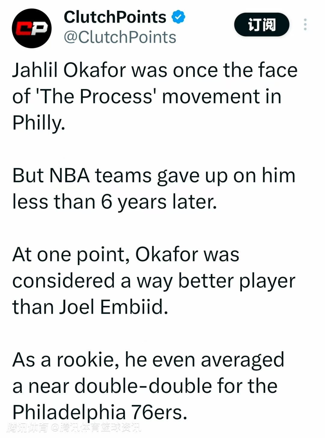 2025-07-30 09:30北京时间7月30日,美媒Clutch Points发文总结前探花秀贾利尔-奥卡福颠沛流离的职业生涯。奥卡福曾是76人“相信过程”口号下的第一张面孔,然而不到6年时间,他便被NBA球队抛弃。