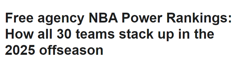 2025-07-31 05:50北京时间7月31日,知名美媒ESPN更新了休赛期的NBA球队实力榜,根据目前的阵容,对30支球队进行初步排名。上赛季的总冠军雷霆高居榜首,换来杜兰特的火箭升至第2。快船第7,勇士第9,湖人第10,选中杨瀚森的开拓者排在第21位。以下是具体排名和相关热门球队的简析——