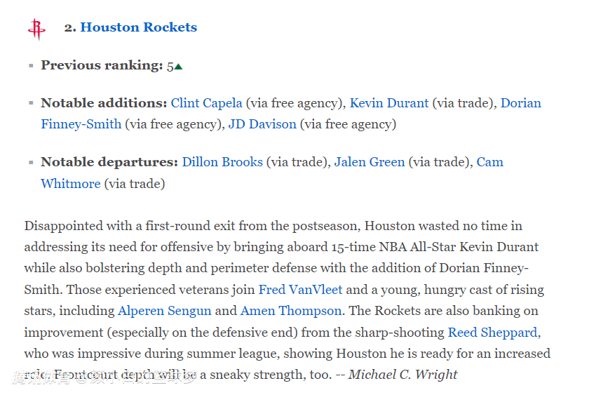 ESPN的评语:实力榜从第五升至第二。季后赛首轮出局后火箭没有浪费太多时间,他们立马引进了15届全明星杜兰特,同时签下了芬尼史密斯加强外线防守与外线投射能力,续约了范弗利特等多位老将;火箭还有像申京、阿门这样的后起之秀,谢泼德也被寄予厚望,这支火箭前场的深度十分出色。