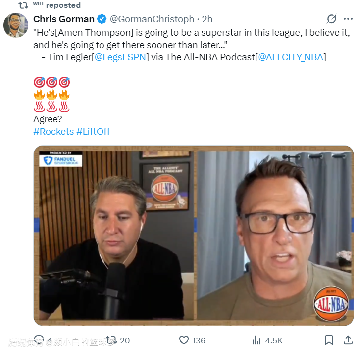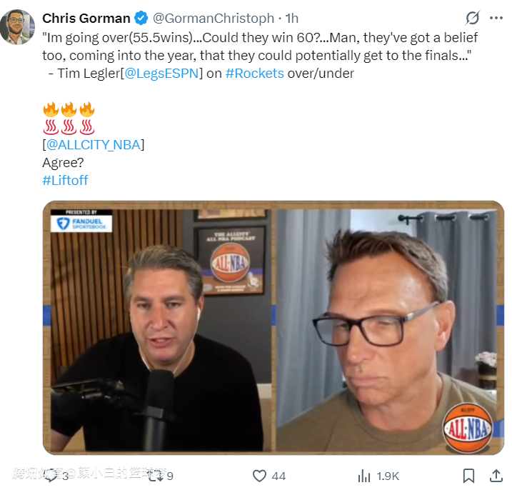 在节目中蒂姆-格莱勒还说道:“我一直都在预测火箭队新赛季的胜场,此前有人说至少55.5胜,那么我在想这支火箭队是否能拿到60+胜呢?天啊,这支火箭队是坚信能打入总决赛的球队啊。上赛季在没有KD的情况下已经拿到50胜,说不定他们真的可以突破自己。”