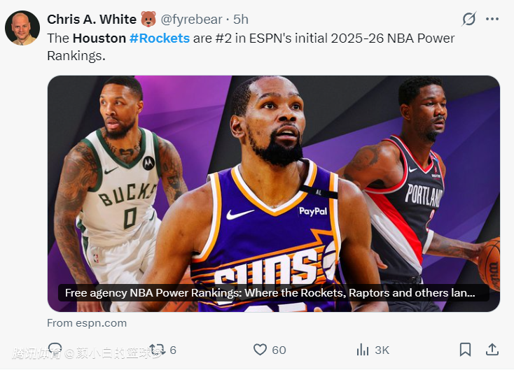 2025-07-31 07:00北京时间7月31日,ESPN对联盟30队的实力排名进行了更新,火箭队升至第二仅次于雷霆队,火箭记者克里斯-怀特立马转发了这条推文。