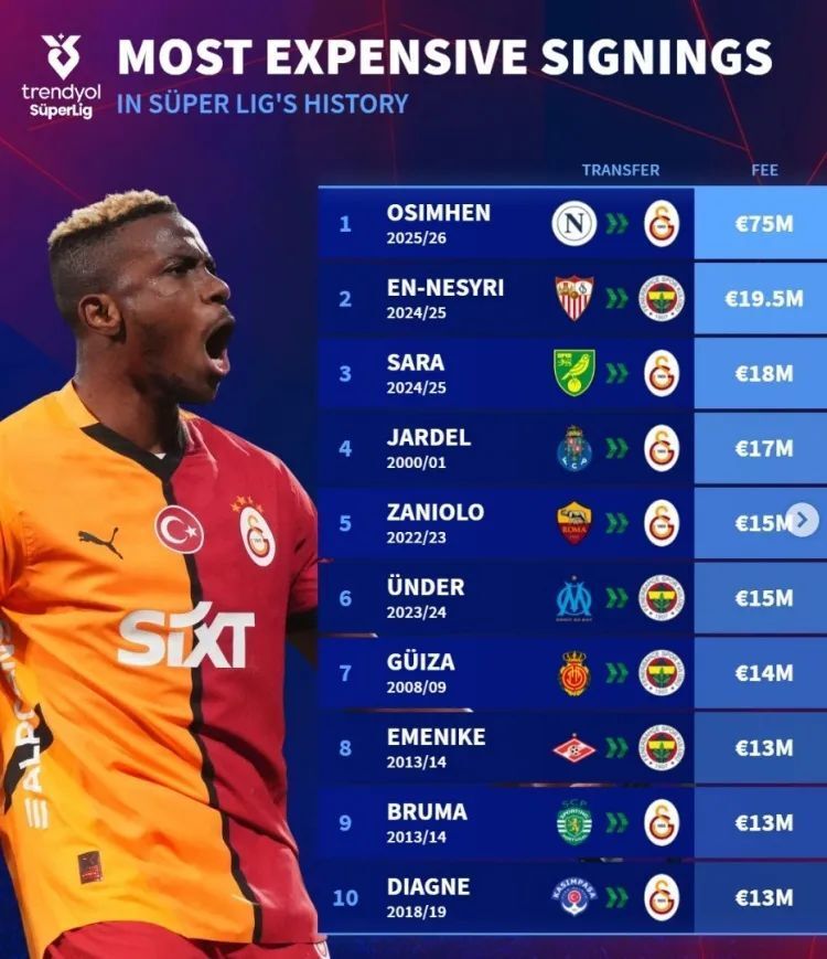 此前,五大联赛之外的欧洲标王是2012年夏从波尔图加盟圣彼得堡泽尼特的浩克(6000万欧元)。奥斯梅恩将土超标王纪录提高了3.85倍(恩奈斯里,1950万),加拉塔萨雷此前队史标王纪录是去夏加盟的萨拉(1800万),提升超过4倍。奥斯梅恩的税后年薪,也将此前土超的顶薪提升了5倍!加拉塔萨雷凭此一桩标王交易,就将俱乐部提升到五大联赛豪门的新维度。