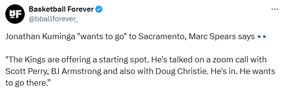 名记Marc Spears报道,库明加承诺加盟国王,该记者表示:国王为他提供了一个首发的位置。他已经与斯科特-佩里(国王总经理)、BJ-阿姆斯特朗(国王总经理助理)以及道格-克里斯蒂(国王主帅)通过视频通话进行了交流,他(库明加)同意了,他想去那里。