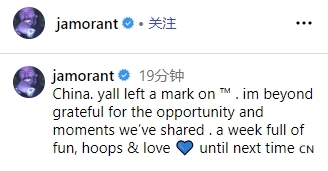 莫兰特写道:“中国,你们在这里留下了深刻的印记。我非常感激能有这样的机会,也珍惜我们共同度过的时光。这一周充满了欢乐、篮球和爱,期待下次再见,中国。”