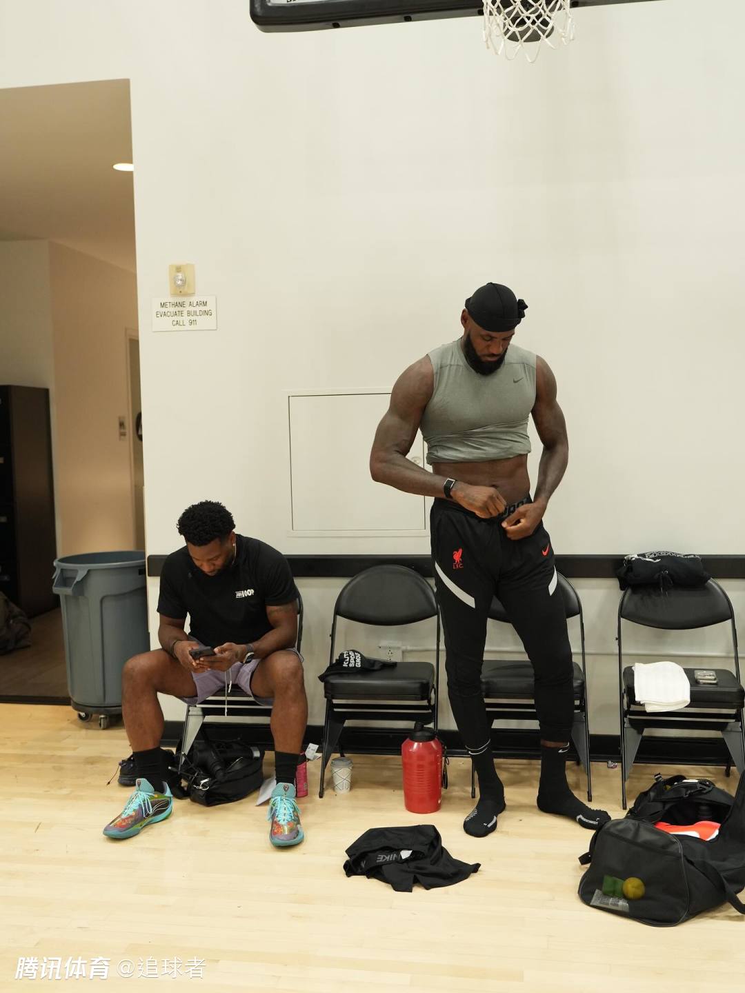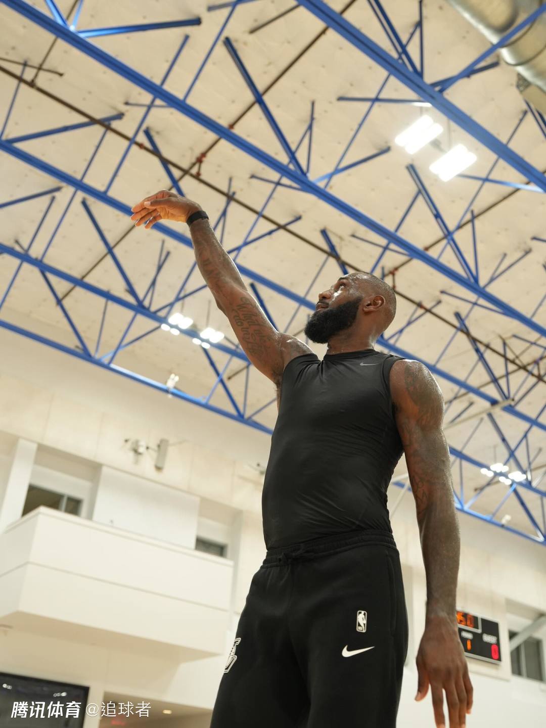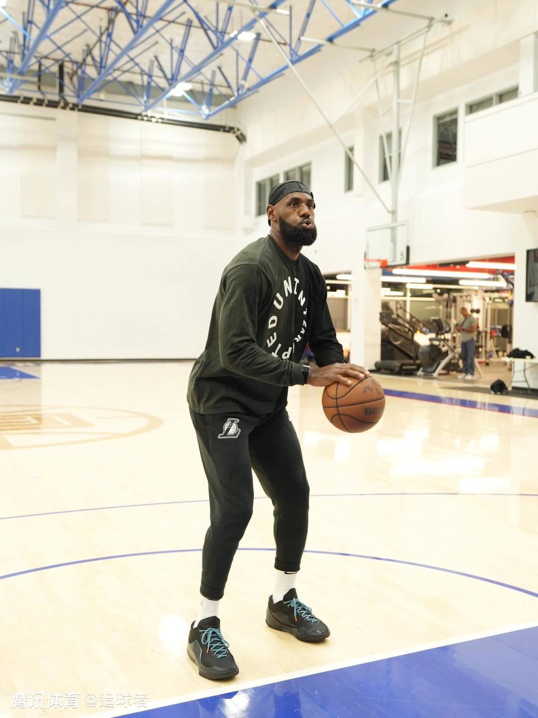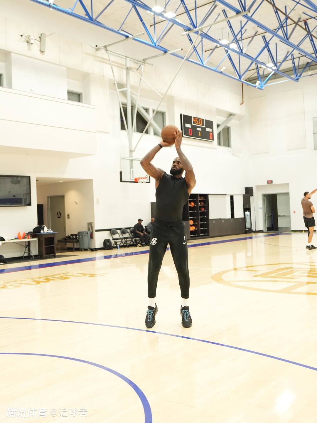 詹姆斯自曝他是在快船队的训练馆中训练的,这应该是快船队的旧训练馆;詹姆斯在这里撸铁以及苦练核心力量,然后前往球场苦练投篮,身穿印有湖人logo的训练服,早已练得浑身大汗。