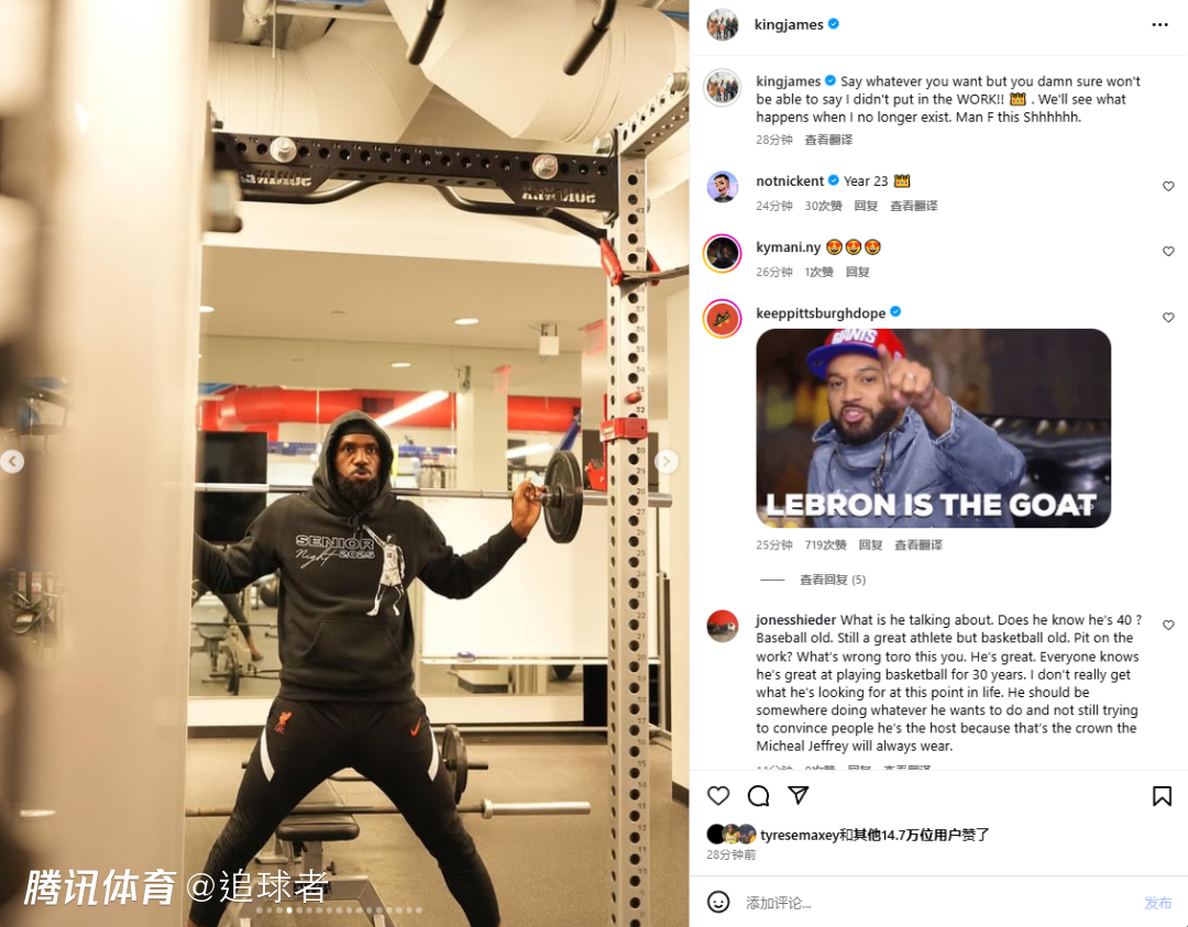 今日詹姆斯更新社媒,连续晒出17张训练照,并且配文写道:随便你们怎么说,但你们TMD绝对不能说我没付出努力!等我退役后,看看会变成什么样吧,去TMD这一切。