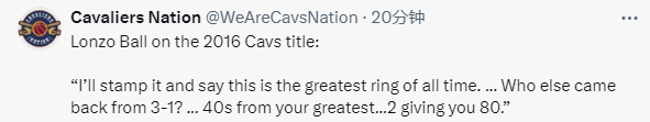 2025-08-01 08:40北京时间8月1日,骑士队球员朗佐-鲍尔接受媒体采访,谈到了骑士队2016年夺得总冠军的话题,而鲍尔认为,2016年这一冠是史上最伟大的一冠。