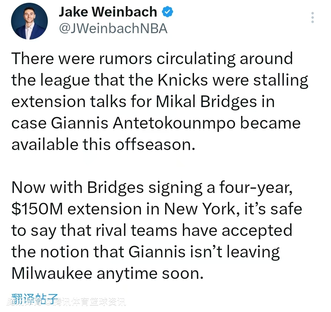 如今,布里奇斯已与尼克斯签下一份四年1.5亿美元的续约合同,这么看来,其他球队应该已经接受了字母哥短期内不会离开密尔沃基的事实。