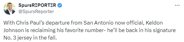 该记者写道:“随着克里斯-保罗正式离开圣安东尼奥,凯尔登-约翰逊将重新启用他最爱的号码——今年秋天,他会身披标志性的3号球衣回归赛场。”