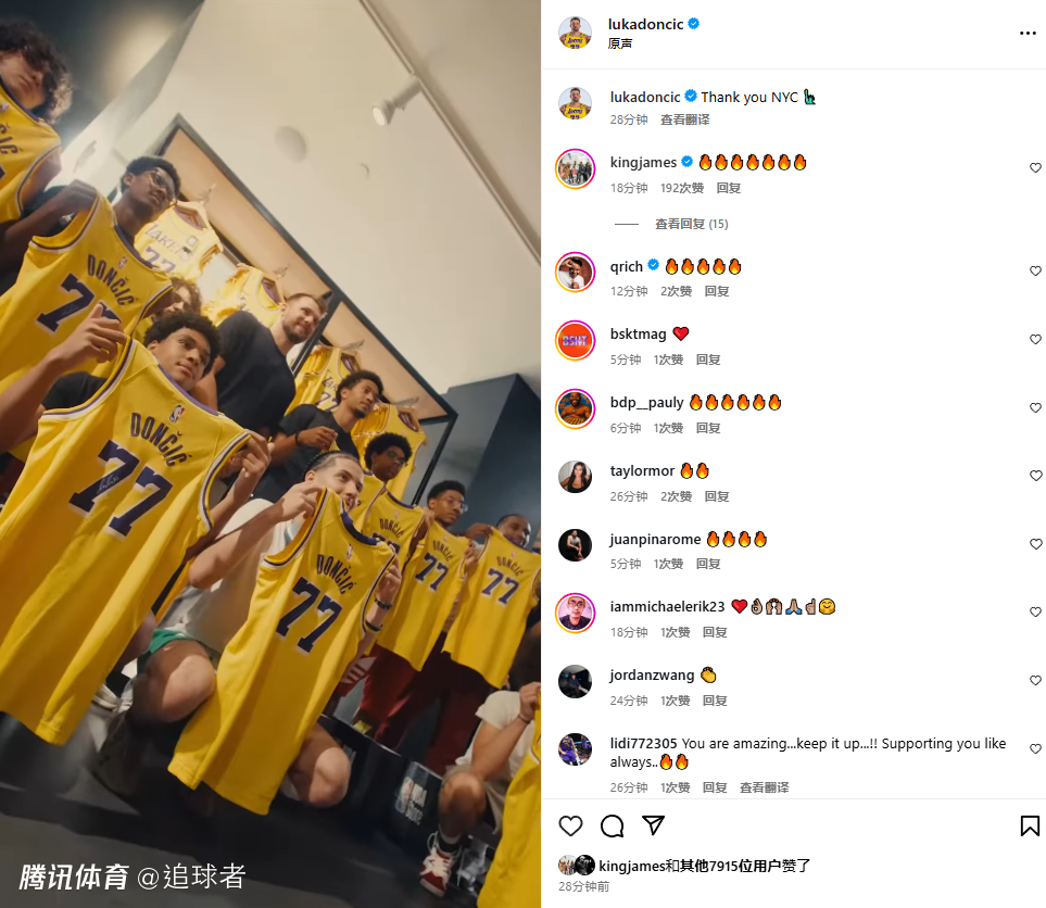 2025-08-01 11:50北京时间8月1日,湖人核心球星卢卡-东契奇更新社交媒体,晒96小时纽约行的精彩时刻,配文写道:谢谢你,纽约;詹姆斯点赞并且直言太火了。