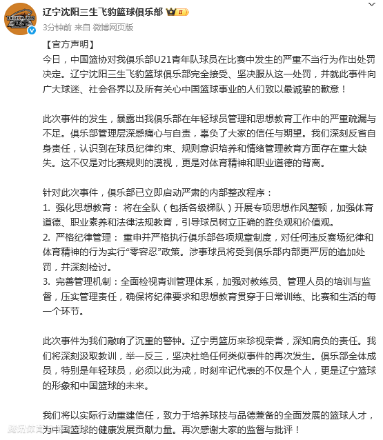 辽宁男篮官方发文回应此次的事件表示:针对此次事件,俱乐部已立即启动严肃的内部整改程序: