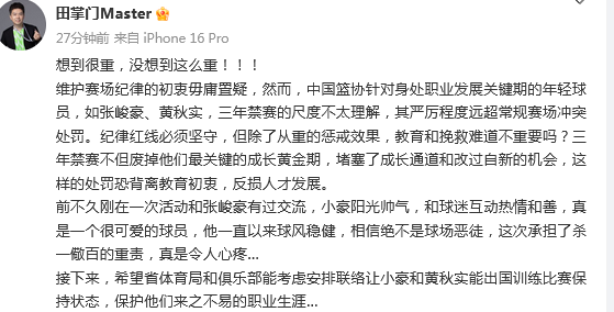 “维护赛场纪律的初衷毋庸置疑,然而,中国篮协针对身处职业发展关键期的年轻球员,如张峻豪、黄秋实,三年禁赛的尺度不太理解,其严厉程度远超常规赛场冲突处罚。纪律红线必须坚守,但除了从重的惩戒效果,教育和挽救难道不重要吗?三年禁赛不但废掉他们最关键的成长黄金期,堵塞了成长通道和改过自新的机会,这样的处罚恐背离教育初衷,反损人才发展。