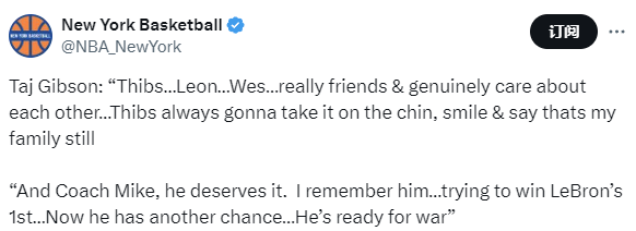 泰-吉布森说道:“锡伯杜和莱昂-罗斯(尼克斯总裁)是真正的朋友,彼此真心关怀。无论遇到什么,锡伯杜总会坦然承受,笑着说‘那依然是我的家人’。还有布朗教练,他值得这一切。我记得他,当年他曾努力想为勒布朗拿下第一个总冠军,如今他又有了一次机会,他已准备好迎接挑战。”