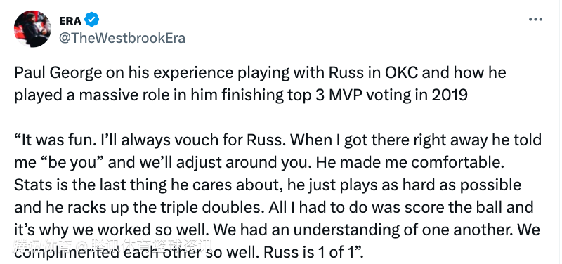 乔治表示:“那段经历很有趣,我会一直为威少辩护。我刚到那儿时,他就告诉我‘做自己就好’,我们会围绕你调整打法。他让我感到自在,数据是他最不在意的东西,他只是竭尽全力去打球,还不断拿到三双,我要做的就是得分,这就是我们配合如此默契的原因。我们彼此理解,相互补充得非常好,威少是独一无二的。”