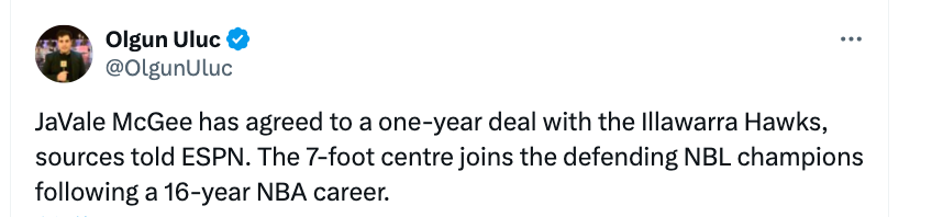 2025-08-01 16:10北京时间8月1日,据美记Olgun Uluc报道,前NBA球员麦基已经同意和澳洲NBL联赛的伊拉瓦拉老鹰签下一份为期1年合同,值得一提的是,老鹰队上赛季刚刚获得NBL联赛的总冠军,球队的主帅老塔图姆正是绿军球星塔图姆的父亲。