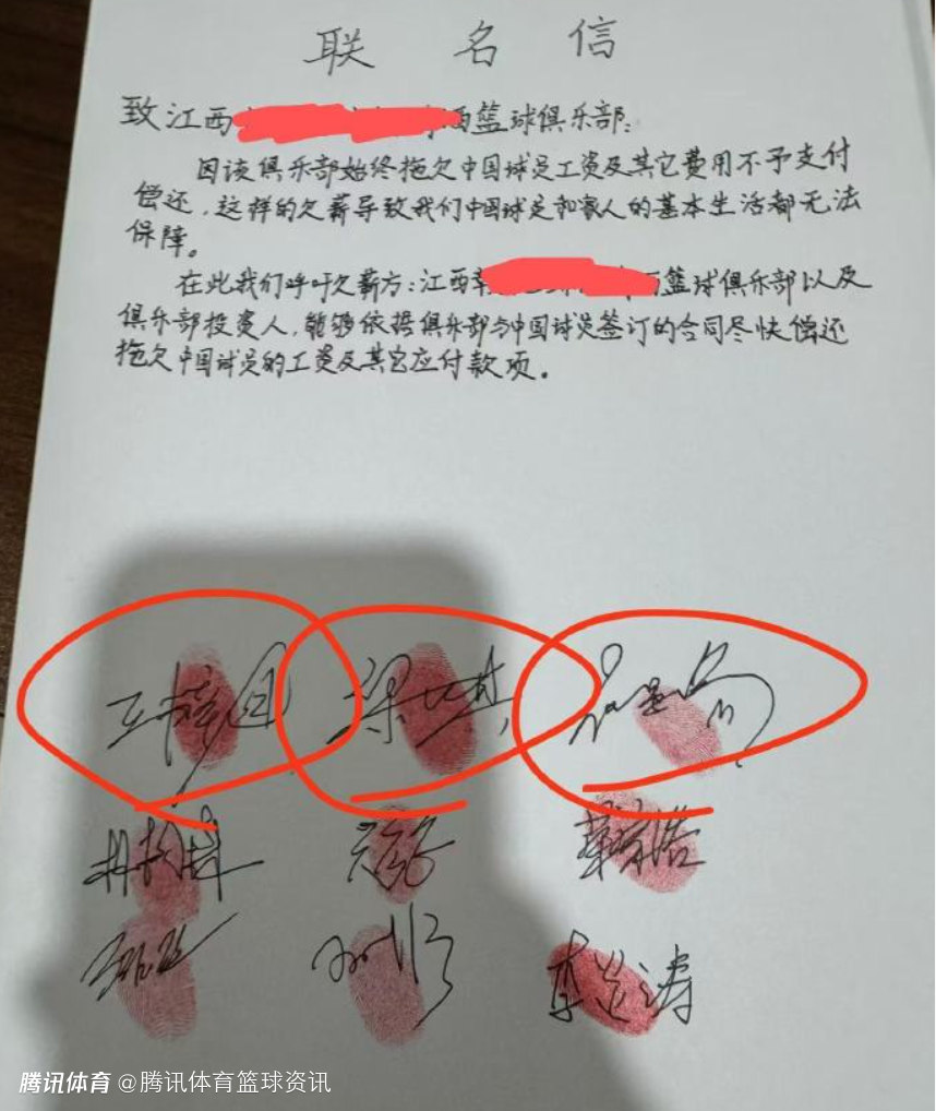近日,一份按着手印、签了名的球员联名信在网上流传,内容是NBL江西某职业篮球俱乐部的9名队员(经我核实,完整版为10人)向俱乐部讨要薪水,他们在信中写道:“俱乐部始终拖欠中国球员工资及其他费用不予支付偿还……导致我们中国球员和家人的基本生活都无法保障。”