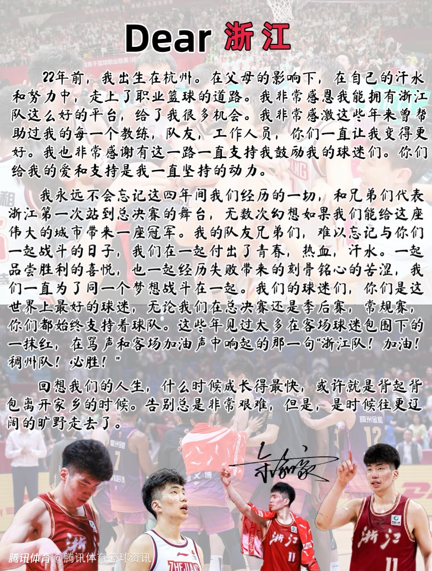我永远不会忘记这四年间我们经历的一切,和兄弟们代表浙江第一次站到总决赛的舞台,无数次幻想如果我们能给这座伟大的城市带来一座冠军。我的队友兄弟们,难以忘记与你们一起战斗的日子,我们在一起付出了青春,热血,汗水。一起品尝胜利的喜悦,也一起经历失败带来的刻骨铭心的苦涩,我们一直为了同一个梦想战斗在一起。我们的球迷们,你们是这世界上最好的球迷,无论我们在总决赛还是季后赛,常规赛,你们都始终支持着球队。这些年见过太多在客场球迷包围下的一抹红,在骂声和客场加油声中响起的那一句 “浙江队!加油!稠州队!必胜!”