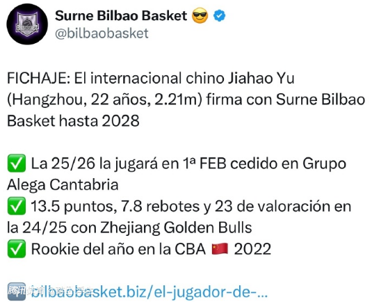浙江男篮并未公布余嘉豪签约的细节,如今毕尔巴鄂官方宣布签约余嘉豪,且公布余嘉豪签约的细节。余嘉豪签约的是3年合同,合同将延续到2028年,且加盟的首个赛季,将被租借到第二级别的西乙Alega Cantabria队。